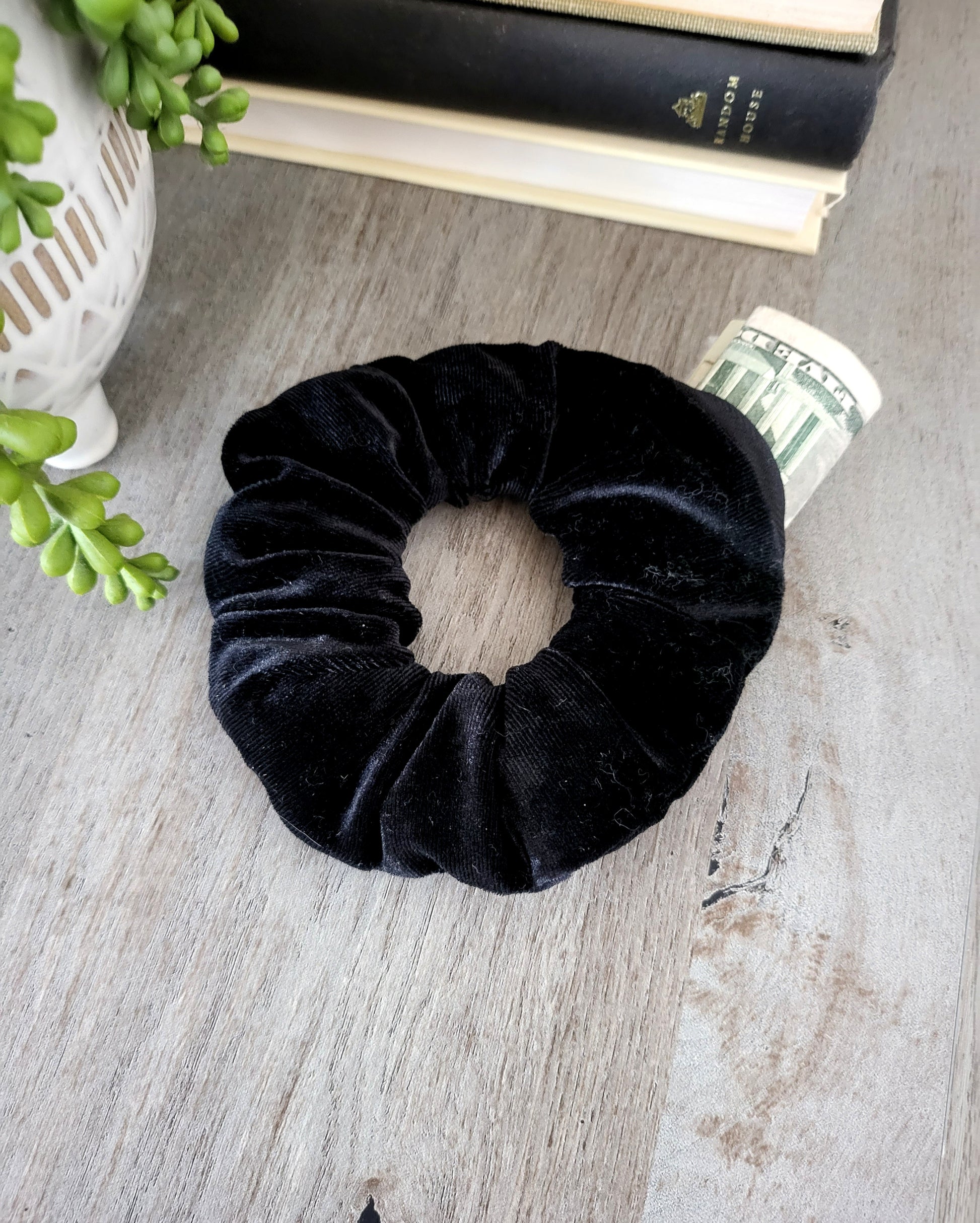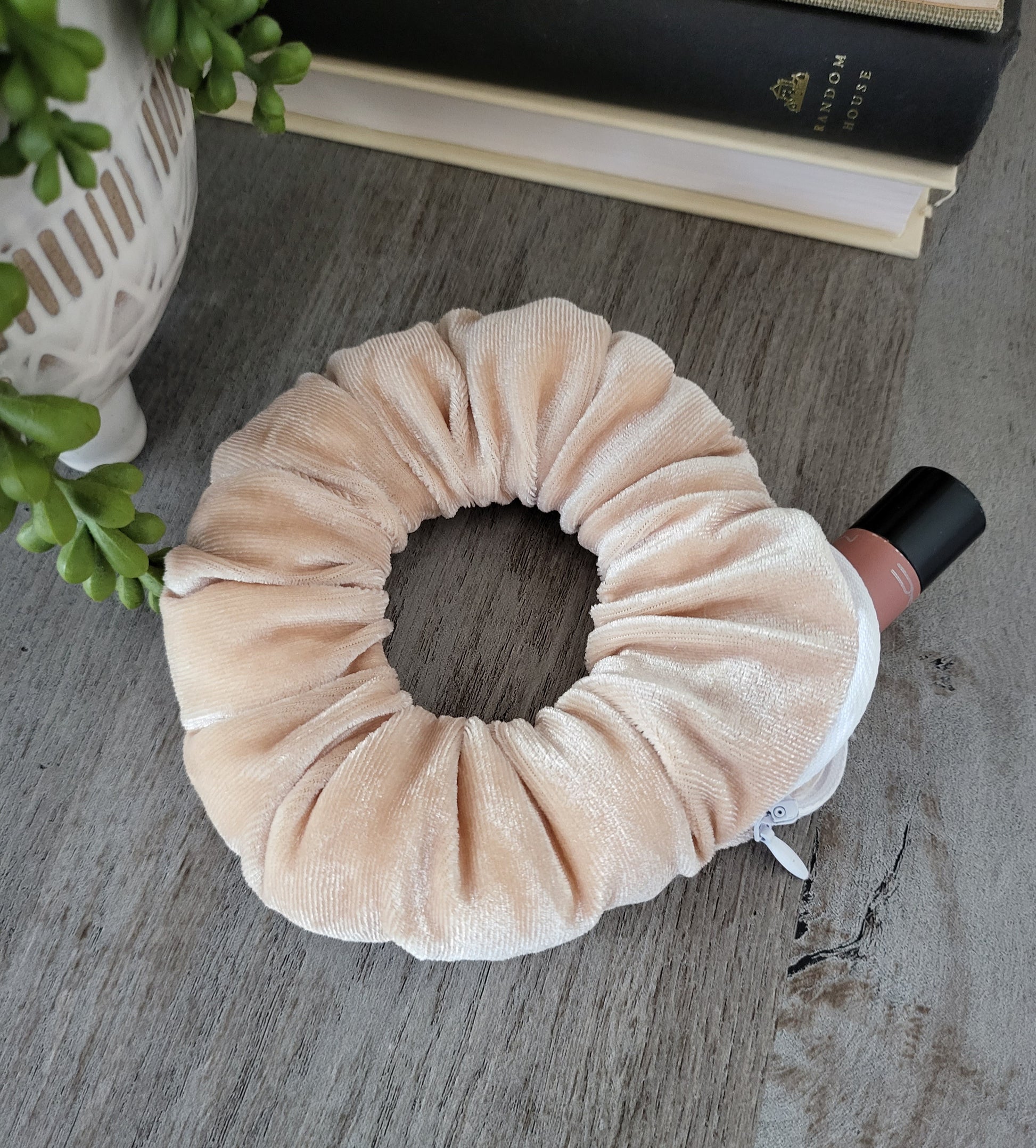 The best of two worlds; Scrunchie hair tie and large hidden compartment for your keys, money, lip balm... endless possibilities. Soft scrunchies with high quality hidden zipper pocket. The zipper becomes un noticeable ones you zip it up Yes! you can wear the scrunchie in your hair with your kept item. Each of the scrunchies is made with durable and highly elastic band that will keep your hair in a perfect ponytail, bun or any other style.