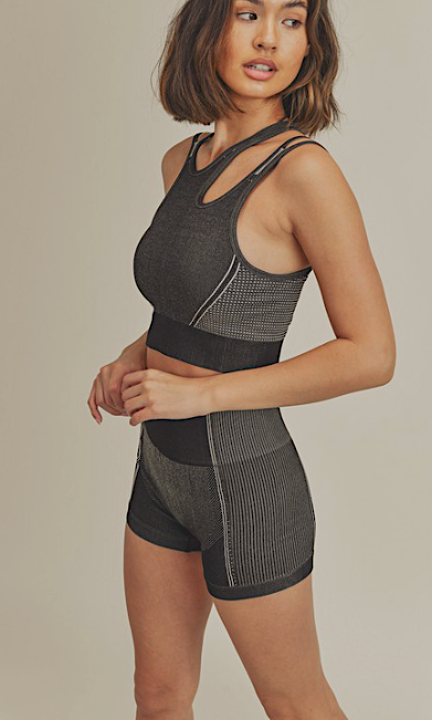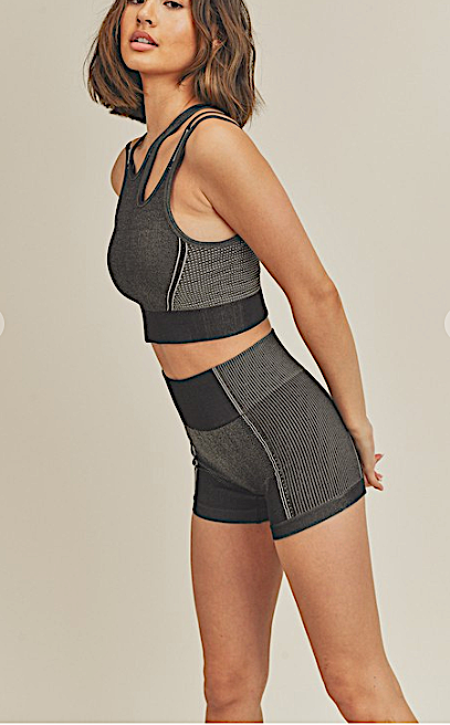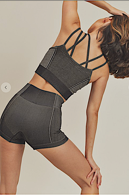 Seamless asymmetric strappy sports bra & shortie set. Stretchy, moisture-wicking with removable bra pads. Rib knit detail on bra and shorts. Show Off your curves with form hugging soft stretch material. Everyday fit, yoga, running, training, or weekend lounge.